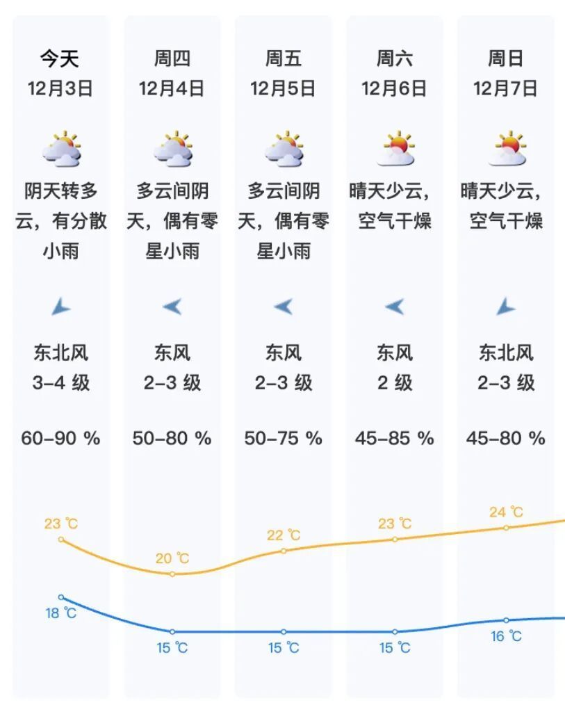 【今日天气】预计受冷空气影响,阴天转多云,有分散小雨,气温18-23℃。